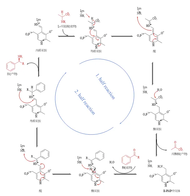 转氨酶的催化遵循“双底物乒乓反应”机制,分为两个半反应。在第一个半反应中,转氨酶中参与催化的赖氨酸与磷酸吡哆醛(PLP)形成内醛亚胺中间体(席夫碱),随后该赖氨酸的ε-NH2作为离去基团被氨基供体的质子化氨基置换,内醛亚胺变为外醛亚胺,然后发生氢的迁移形成醌中间体。醌中间体容易质子化,从而生成酮亚胺中间体,酮亚胺在活性位点赖氨酸的催化下水解生成相应的产物酮以及带有氨基的E-PMP中间体,从而完成氧化脱氨反应。在第二个半反应中,含有酮的底物受到PMP氨基的亲核攻击,得到酮亚胺,酮亚胺经去质子化和氢的迁移得到相应的醌中间体和外醛亚胺,最后在赖氨酸的作用下得到氨基产物和PLP。